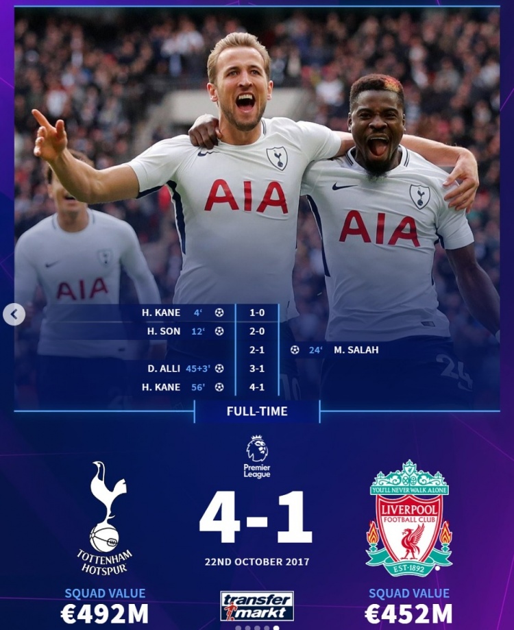 2017年10月,英超:热刺主场4-1利物浦。孙凯上半场各进一球,萨拉赫扳回一城,阿里上半场补时破门,凯恩下半场再进一球锁定胜局。
