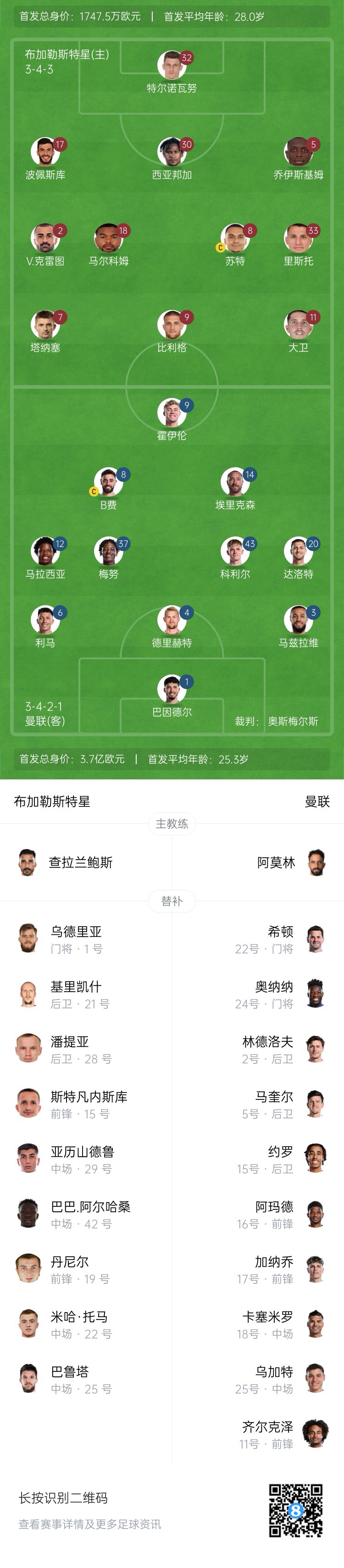 1月31日讯 欧联杯联赛阶段第8轮,布加勒斯特星主场迎战曼联比赛即将打响。赛前首发出炉。