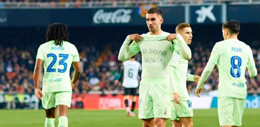 巴萨前锋费兰今日对阵老东家瓦伦西亚戴帽,他进球后没有庆祝,并掀开球衣表示对瓦伦灾民的纪念:“别忘记瓦伦洪水受害者”。