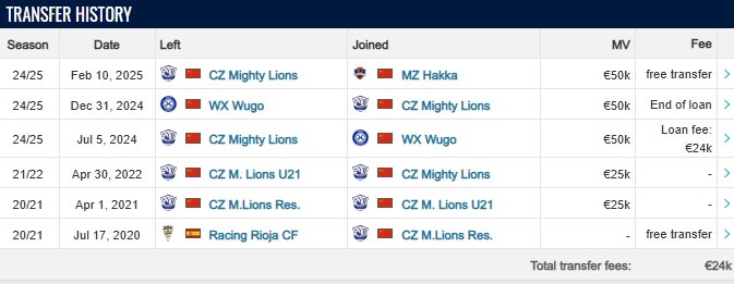德转显示,孙健祥于2025年2月10日正式和梅州客家签约,双方合同薪资和年限没有公布,目前球员德转身价为5万欧元。