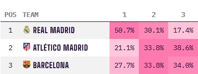 Opta预测三强最终分差仅在一场球以内,皇马季末预测积分为83分,巴萨80-81分,马竞80分。