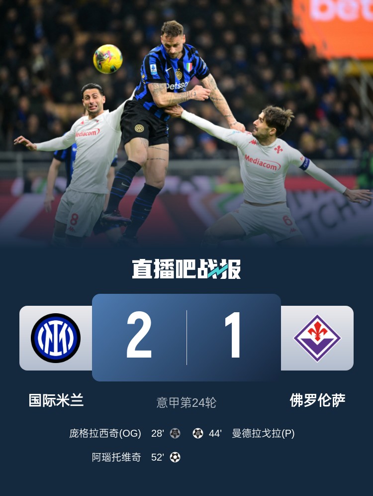 本轮意甲,国米2-1击败佛罗伦萨,劳塔罗造乌龙,阿瑙制胜。此役后国米距榜首1分。