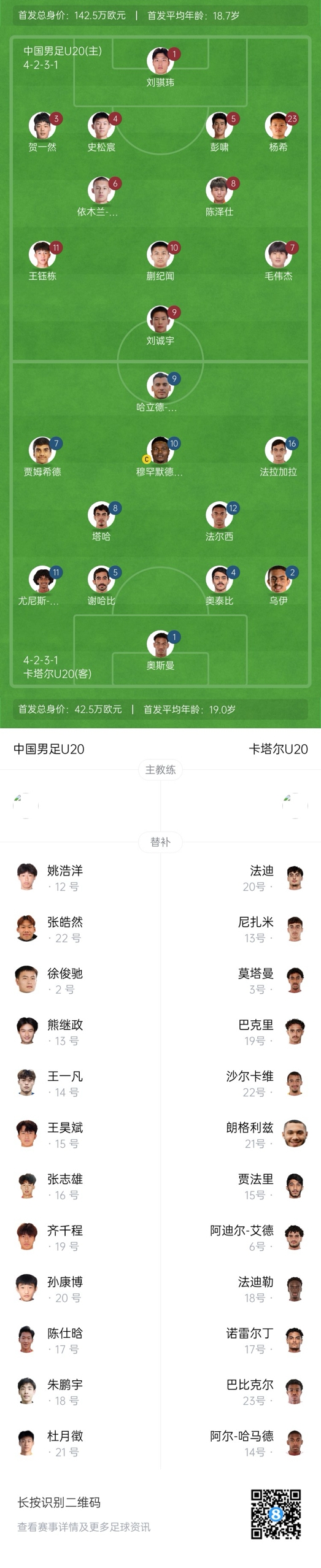卡塔尔U20首发:1-阿布贝克尔-奥斯曼、2-阿尤布-乌伊、4-奥泰比、5-谢哈比、11-尤尼斯-巴拉、12-法尔西、8-塔哈、10-易卜拉欣-穆罕默德-阿里、7-贾姆希德、9-古达、16-法拉加拉