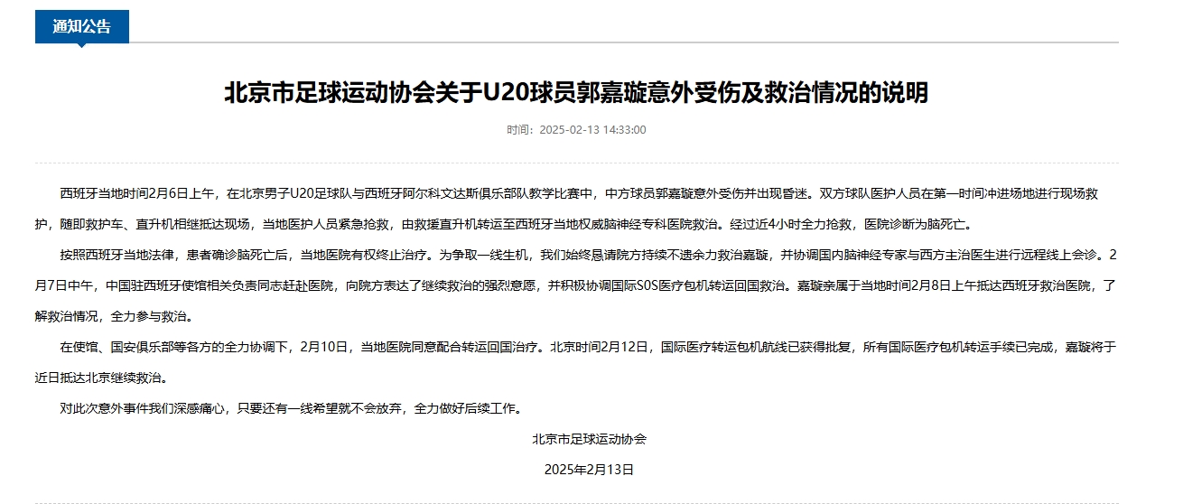 西班牙当地时间2月6日上午,在北京男子U20足球队与西班牙阿尔科文达斯俱乐部队教学比赛中,中方球员郭嘉璇意外受伤并出现昏迷。双方球队医护人员在第一时间冲进场地进行现场救护,随即救护车、直升机相继抵达现场,当地医护人员紧急抢救,由救援直升机转运至西班牙当地权威脑神经专科医院救治。经过近4小时全力抢救,医院诊断为脑死亡。