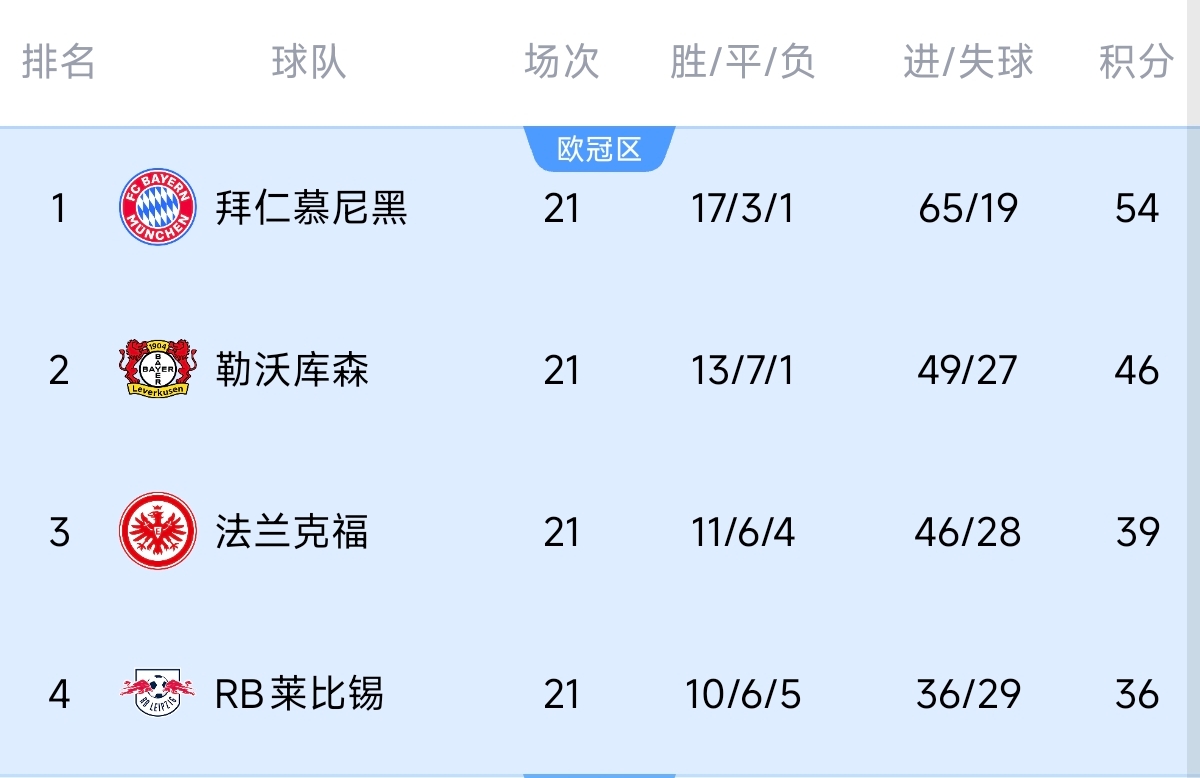 五大联赛榜首球队领跑优势:
