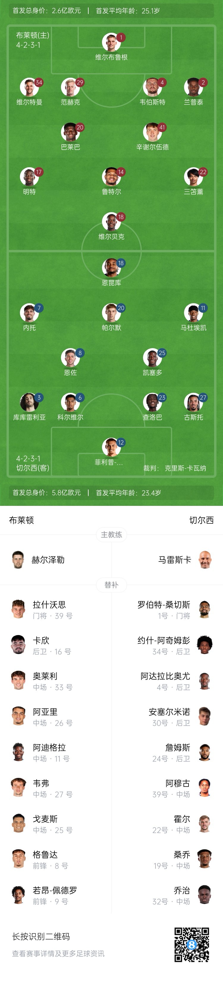布莱顿首发:1-维尔布鲁根、34-维尔特曼、29-范赫克、4-韦伯斯特、2-兰普泰、20-巴莱巴、41-辛谢尔伍德、17-明特、14-鲁特尔、22-三笘薰、18-维尔贝克