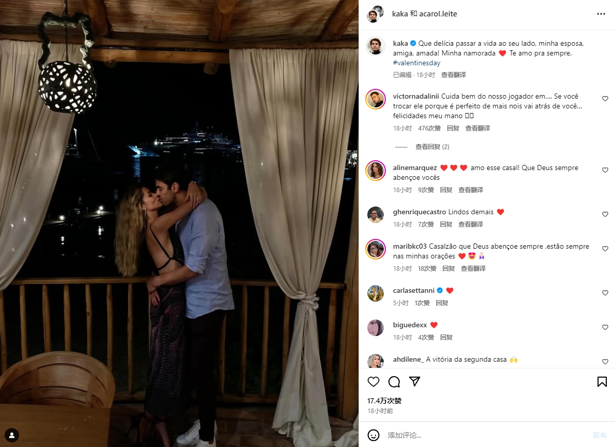 02月15日讯 情人节,卡卡社媒晒出与妻子卡洛琳娜(Carolina Batista Leite)亲吻照。