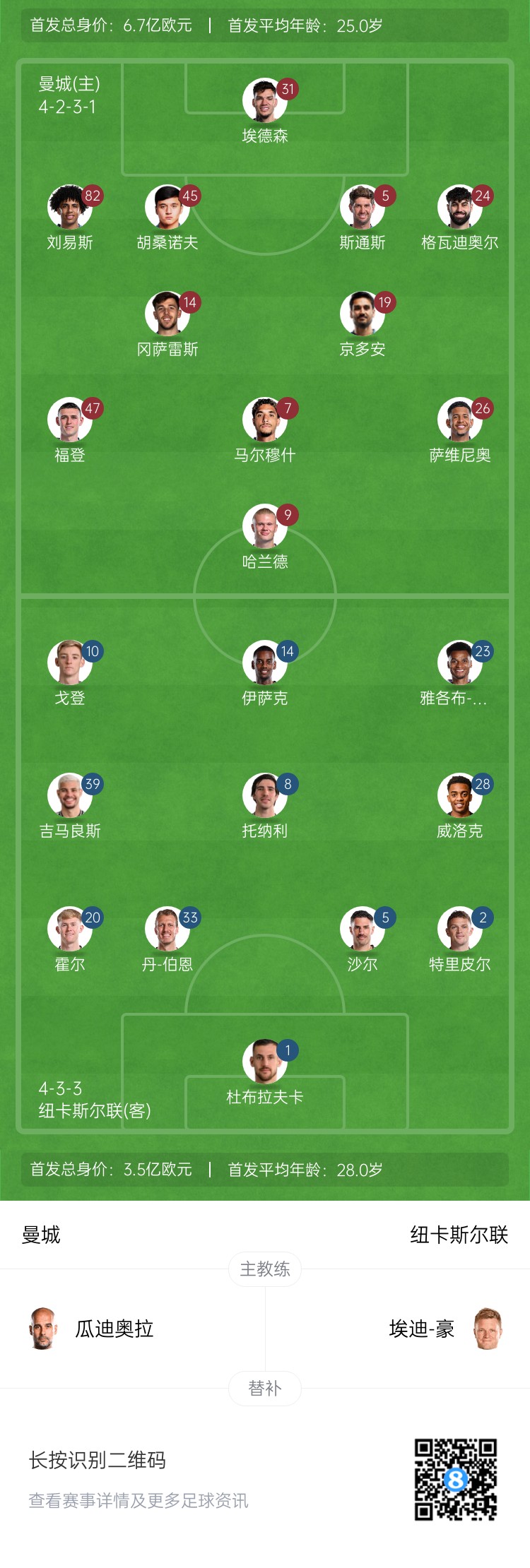 曼城首发:31-埃德森、82-刘易斯、45-胡桑诺夫、5-斯通斯、24-格瓦迪奥尔、14-尼科-冈萨雷斯、19-京多安、47-福登、7-马尔穆什、26-萨维尼奥、9-哈兰德