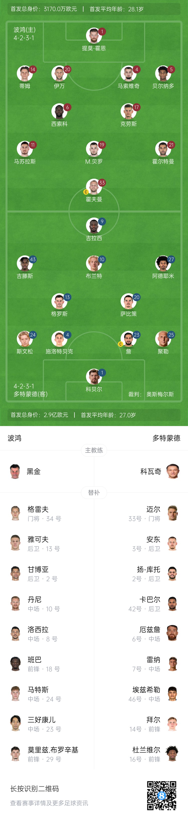 多特首发:1-科贝尔、4-施洛特贝克、24-斯文松、25-聚勒、10-布兰特、13-格罗斯、20-萨比策、23-埃姆雷-詹、9-吉拉西、27-阿德耶米、43-吉滕斯