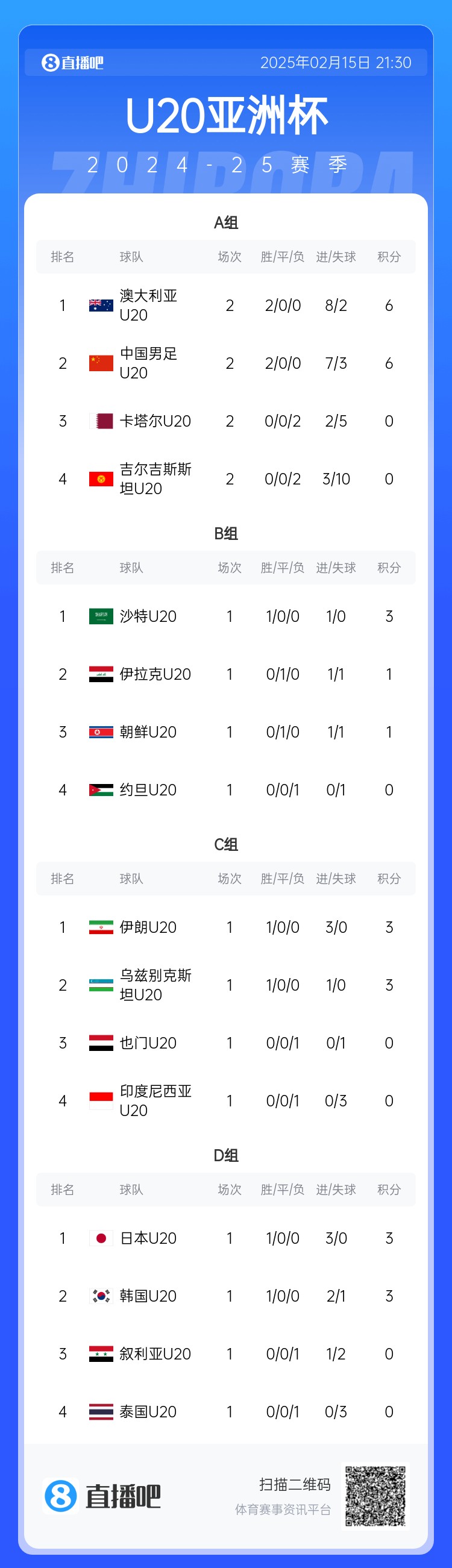 提前晋级8强!U20亚洲杯A组积分榜:中国6分小组第2,澳大利亚第1