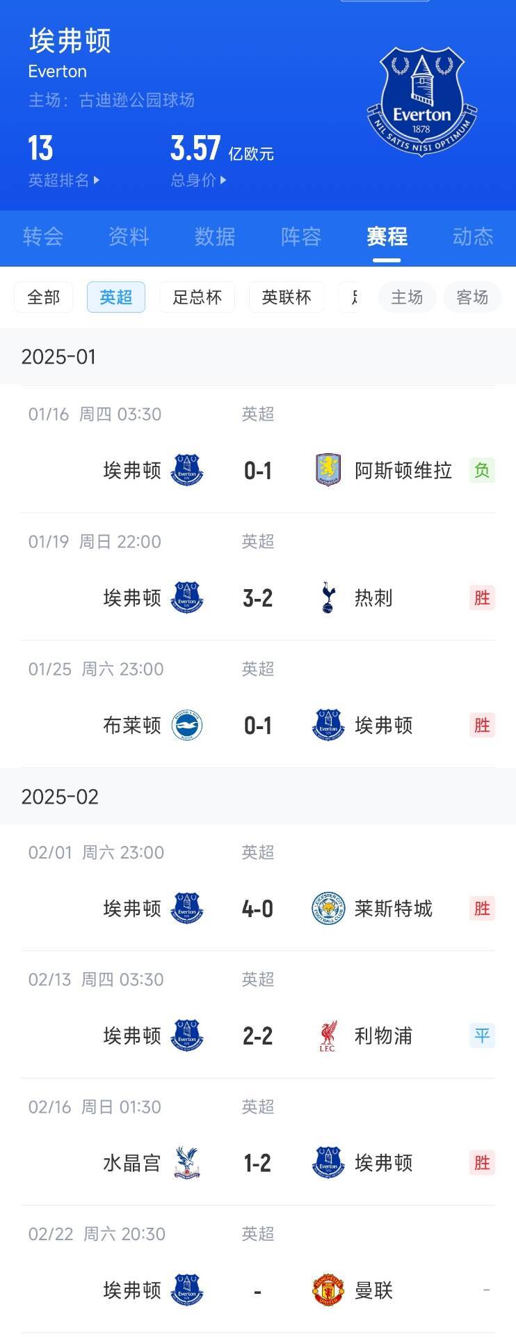 02月16日讯 英超第25轮,埃弗顿2-1客胜水晶宫,近5轮4胜1平狂揽13分。莫耶斯上任之后6场英超比赛,只在首秀0-1输了维拉。