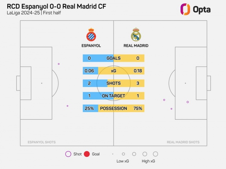 半场0-0!皇马上半场仅3射门,追平本赛季客场上半场最少纪录 2月2日讯 皇马在本轮西甲客战西班牙人,两队上半场0-0战平。数据统计显示,皇马在本场上半场仅射门3次,追平本赛季各项赛事上半场射门最少纪录。 2025/02/02